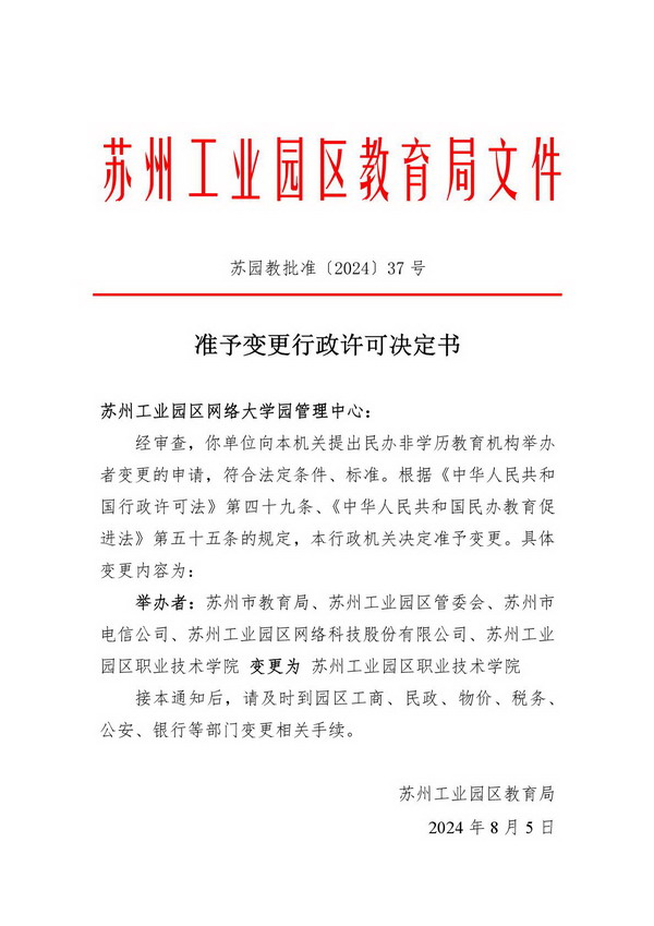苏州工业园区网络大学园管理中心准予变更行政许可决定书